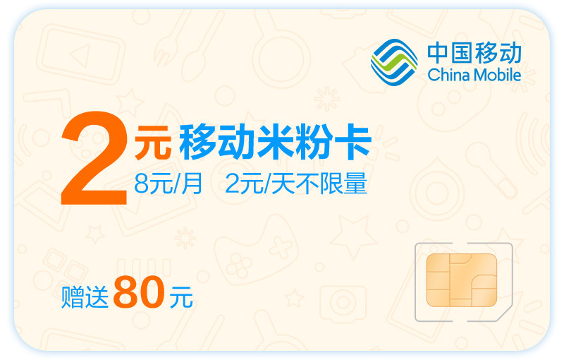 2元日租版移动米粉卡:每月需要支付的月费是8元,而首月赠送80元话费(20天有效),每天2元流量随意使用,月流量使用累计达到20GB后限速,限速速率不高于1Mbps,而使用这个套餐用户不可订购中国移动其余各类流量包。