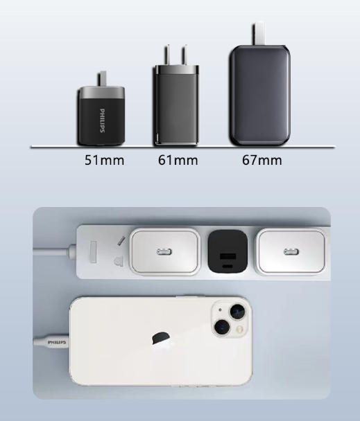 飞利浦的氮化镓快充充电器67W的体积压缩到42mm*39mm*51.4mm,同时提供2个充电接口,可以同时实现2个设备的快充,拥有更高的实用性。