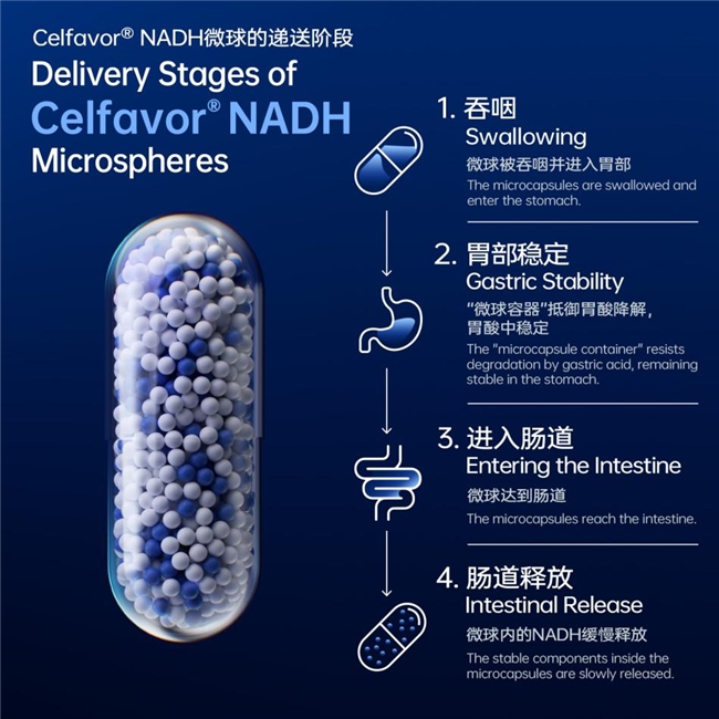 以衰老干预核心成分NADH为例,普通NADH在常温环境下6-12个月活性会降解 50%,而采用 Celfavor®微球技术封装的NADH,在常温避光条件下货架期可延长至 36个月,稳定性提升6倍以上,更重要的是这种稳定性技术也同时解决了NADH难以多成分复配的难题。