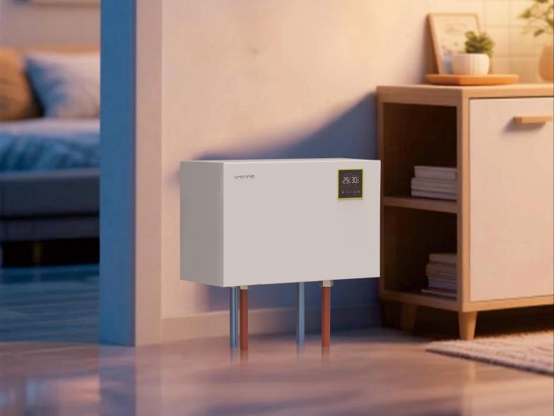 地暖宝的厉害之处,在于它不直接“造热”,而是“搬热”。它是一台家用小型水源热泵,能从集中供暖的暖气管里,把那些没被利用的低温余热(26-33℃)“抓”出来,通过COP9热泵系统压缩提温,变成45-55℃的高温热水,在室内循环供暖。