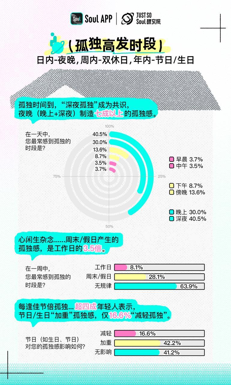 在较长的一周周期之中,周末/假日产生的孤独时刻是工作日的 3.5 倍之多;而在年内,42.2%的年轻人表示节日/生日会“加重”自己的孤独感,前者是喜气洋洋的乐景衬托出“作者”的哀情,后者是越长大越孤单,越长大越不安......