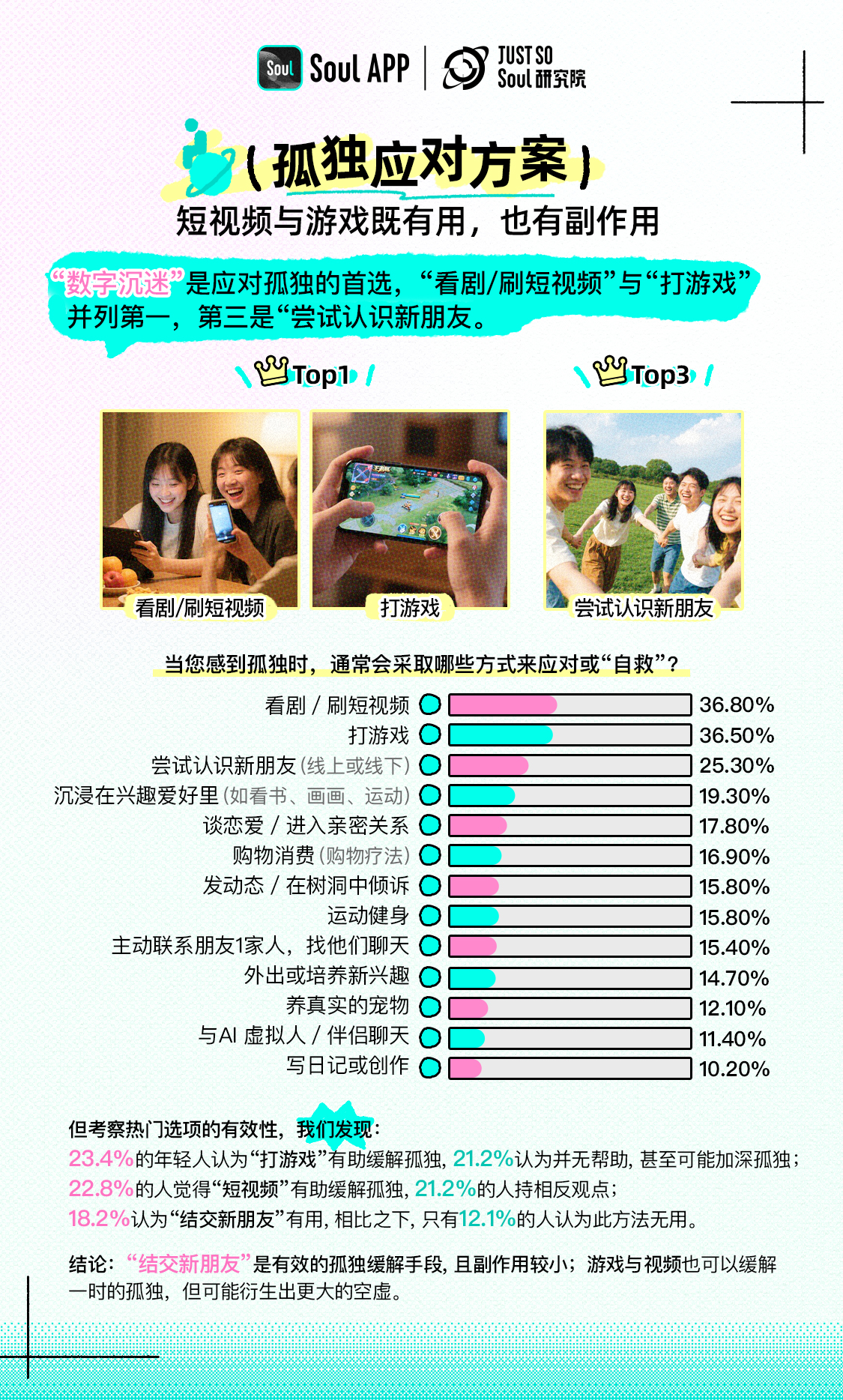 相比之下,有 25.3% 的年轻人认为“认识新朋友”有助于缓解孤独,且这种方案的“不满意率”只有 12%(相较游戏与短视频均超过 20%)综合来看,“结交好友”是有效手段中副作用最小的,因其能直接针对孤独的本质——高质量社交连接的缺失。