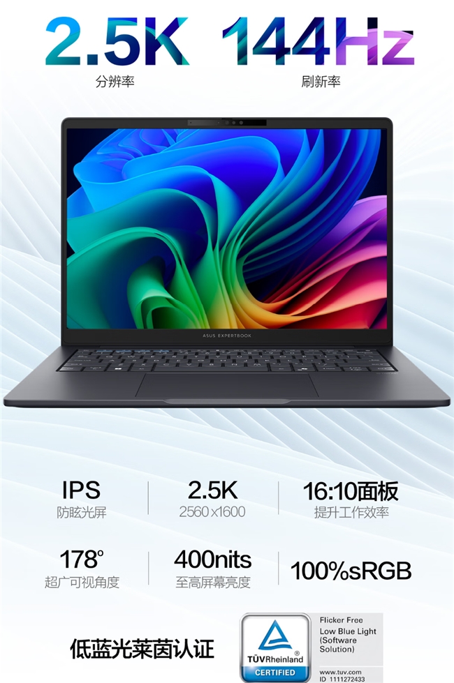 移动办公场景中,屏幕显示效果直接影响工作体验。华硕破晓6S幻金版选用一块14英寸2.5K IPS高刷护眼屏,并以84%屏占比为用户带来沉浸式视觉体验;144Hz刷新率确保页面滚动和视频播放流畅自然;100% sRGB高色域呈现真实生动的色彩;400nits亮度让屏幕在候机厅等强光环境下依然清晰可读。值得一提的是,华硕破晓6S幻金版还支持硬件级低蓝光技术,能有效缓解长时间使用的视觉疲劳,呵护办公人士的眼部健康。