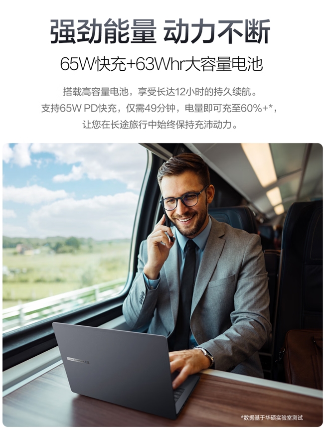 续航能力是差旅办公的重要考量因素。63Whrs大容量电池配合高能效处理器设计,让华硕破晓6S幻金版能为客户提供至高12小时的续航表现,足以应对用户长途飞行或整日会议的使用需求。支持65W快充技术,49分钟即可充至60%的电量,让用户在航班中转的碎片时间得到充分利用,确保设备随时保持工作状态。
