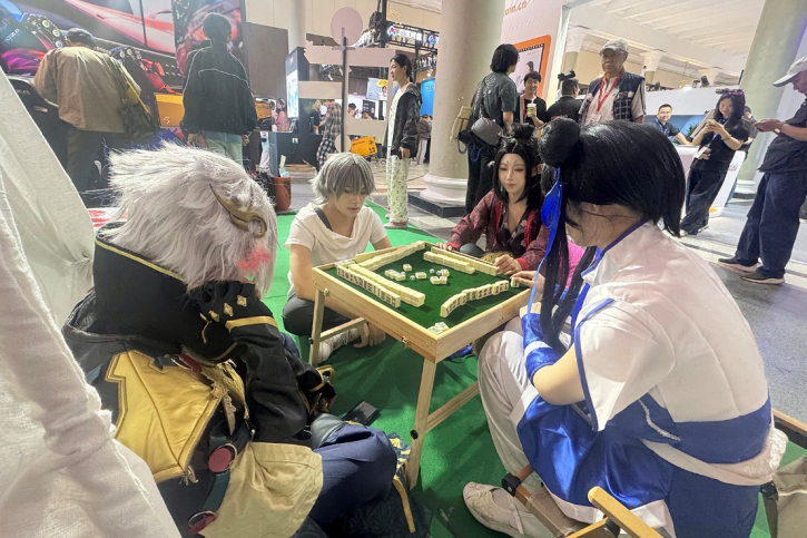 所以,在我们的展位上,有懒人沙发,有巨大的筛子玩具,有打卡牌,甚至还有——麻将桌。有趣的是,这台麻将桌吸引了许多年轻人来玩。四位来自主办方邀请的Coser小姐姐,小哥哥们借着休息的机会,干脆来这里休闲一把。