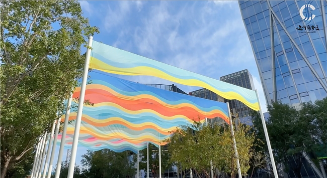 在北皇木厂南街,有一个十分显眼的“运河商务区”标志牌,这里就是运河商务区的核心地段。在这处标志后面的步道,各种颜色的挂旗景观格外生动,仿佛在欢迎着每一位行人。该组作品的意象为“可穿越的运河史诗”,切⽚状布料象征着运河古船龙骨与⽔⽂曲线的融合。从正面看,宛如层叠透视的运河航道;从侧面看,则装饰着商务区的天际剪影。