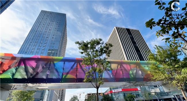 除了这组迎面而来的挂旗景观,附近侨商中心的连廊也经过了专门设计:连接3号楼和7号楼的连廊运用了3M超透贴膜工艺,呈现出了渐变、交融的艺术效果,宛如秋色浸染、波光粼粼的大运河;连接7号楼和10号楼的连廊,色块形态仿佛是流动的光谱。据设计方介绍,这组设计既呼应了运河的灵动,又象征商务区的创新,目的是打破建筑界面的生硬感,为通勤空间注入艺术活力。此外在龙舟路的远洋乐堤港、惠济东路的新光大中心,其连廊也通过不同设计风格的应用,为运河商务区增添了色彩。