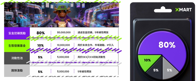 $XMT 80%的分配通过盲盒挖矿产出,5年线性释放,确保价值回归社区;10%作为生态发展基金,用于未来的合作伙伴激励、市场推广和IP引入;5%用于流动性池,为初期DEX和CEX交易提供流动性支持;团队只拿5%,同样5年线性释放。