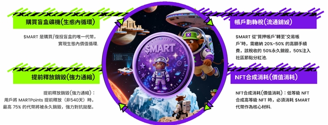 为了防止资金在低水平上无效空转,XMART打破了“躺平复投”的惯性。在 XMART 的逻辑里,简单的重复投入不再是最优解,递增的税率机制逼迫资金必须向上流动.用户要么选择升级盲盒等级,要么拉长持有周期来获取更高的资本效率。与此同时,通胀的压力被分散到了每一次具体的交互中。无论是购买新矿机、账户资金划转,还是为了获得稀有 NFT 进行合成,都在实时触发代币的刚性销毁。这意味着 $MART 的价值不仅仅来源于“挖掘”,更支撑于无处不在的“消耗”,这种供需平衡构成了 $MART 价值的坚实基础。
