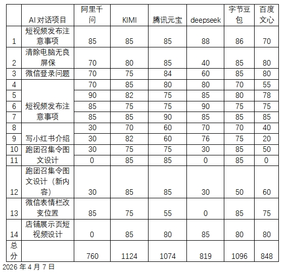 - 写小红书介绍(两次):KIMI70分、82分,DeepSeek70分、76分,豆包70分、75分,元宝60分、60分,文心40分、20分,千问30分、30分