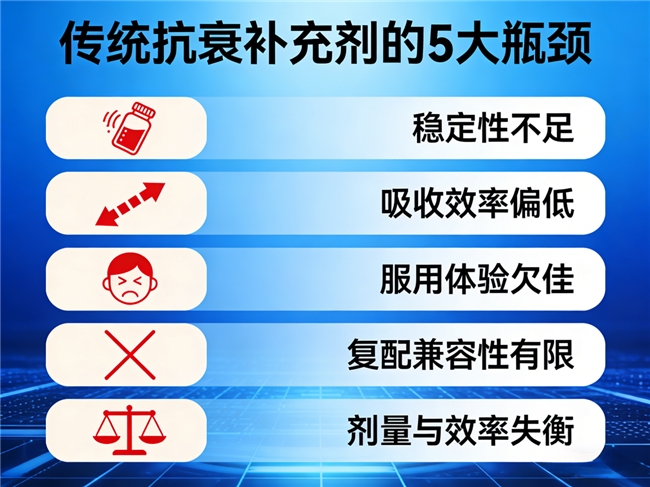 长期以来,传统抗衰补充剂在实际应用中始终面临多个关键难题,这些问题使得活性成分补充往往陷入“吃而无效”的尴尬局面,也成为行业升级的重要瓶颈。