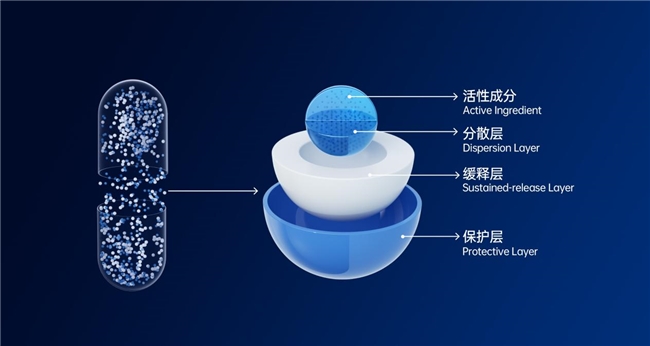 CELFULL Celfavor®技术是源于创新药研发的制剂技术,采用的是多核+可溶性壁材的微球结构,以高分子材料构建微型容器,将活性成分与空气、水分、光照、胃酸完全隔绝;通过AI优化壁材与释放动力学,实现耐胃酸、肠道靶向、24小时持续缓释,并大幅提升货架期稳定性。